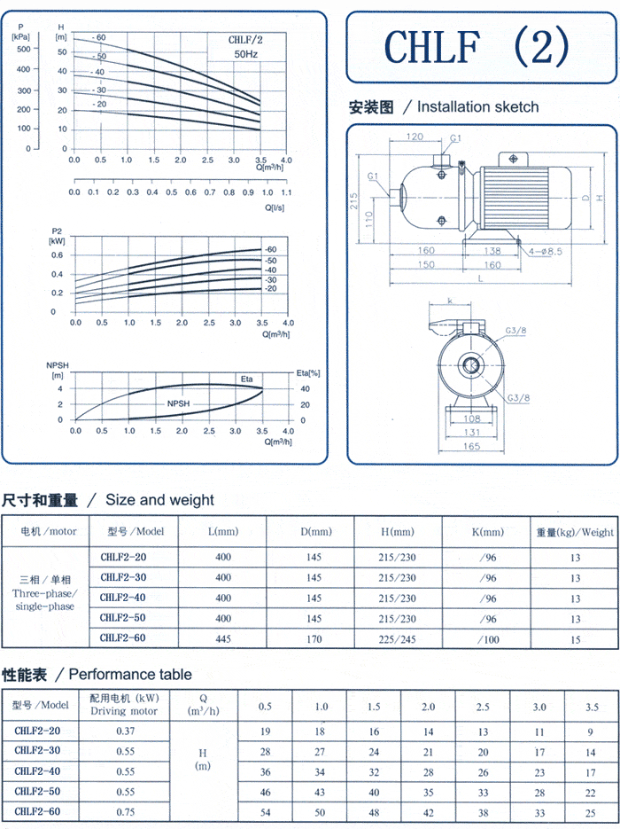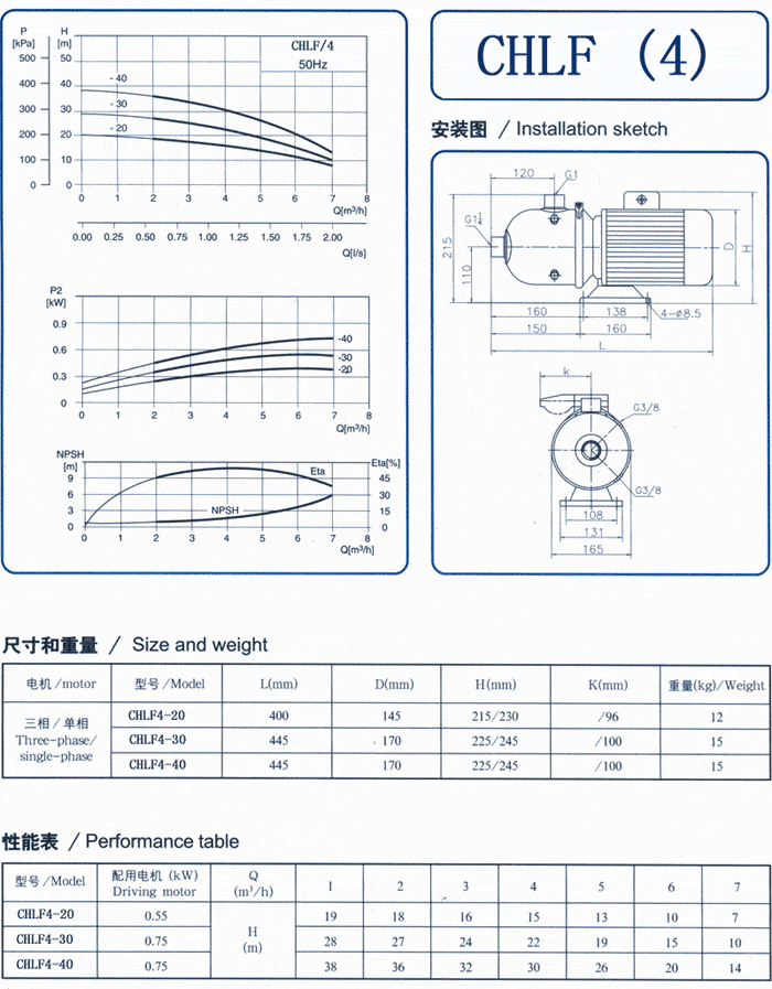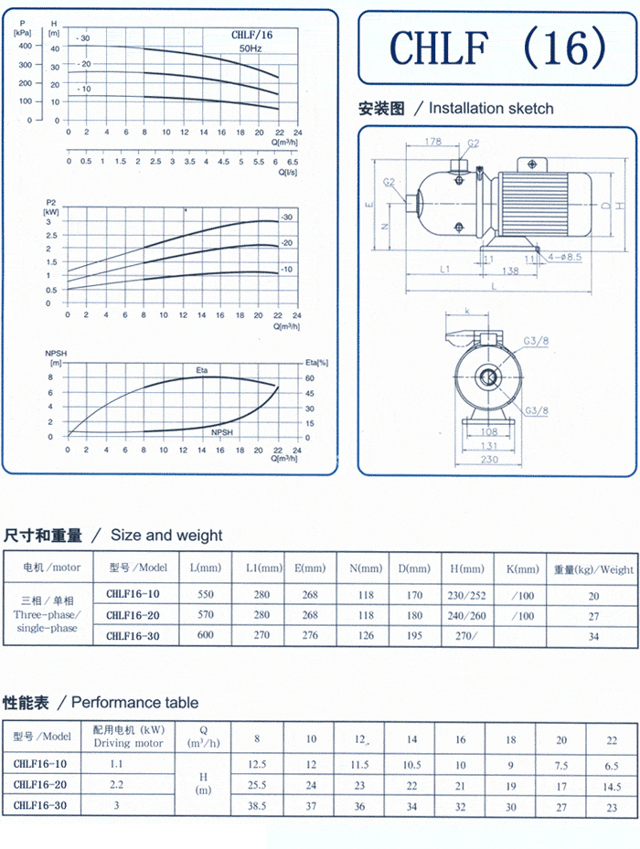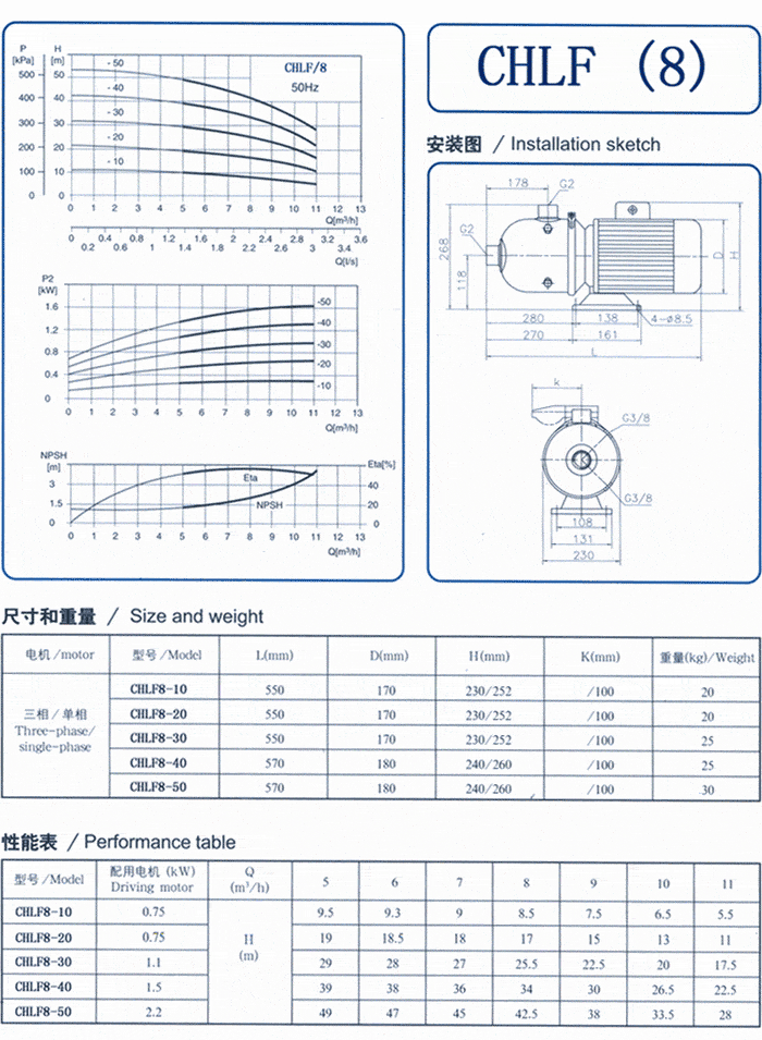 CHL,CHLK和CHLF(T)輕型臥式多級(jí)離心泵采用了機(jī)械密封。泵的過流部件均采用不銹鋼材料(304或316)制成,具有低噪音,耐輕腐蝕,外形美觀、體積小、重量輕、使用壽命長(zhǎng)等特點(diǎn)。