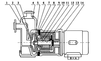 | 8.隔離層 | 9.外磁鋼總成 | 10.內(nèi)磁鋼總成 | 11.泵軸 | 12.軸套 | 13.聯(lián)接架 | 14.電機 |